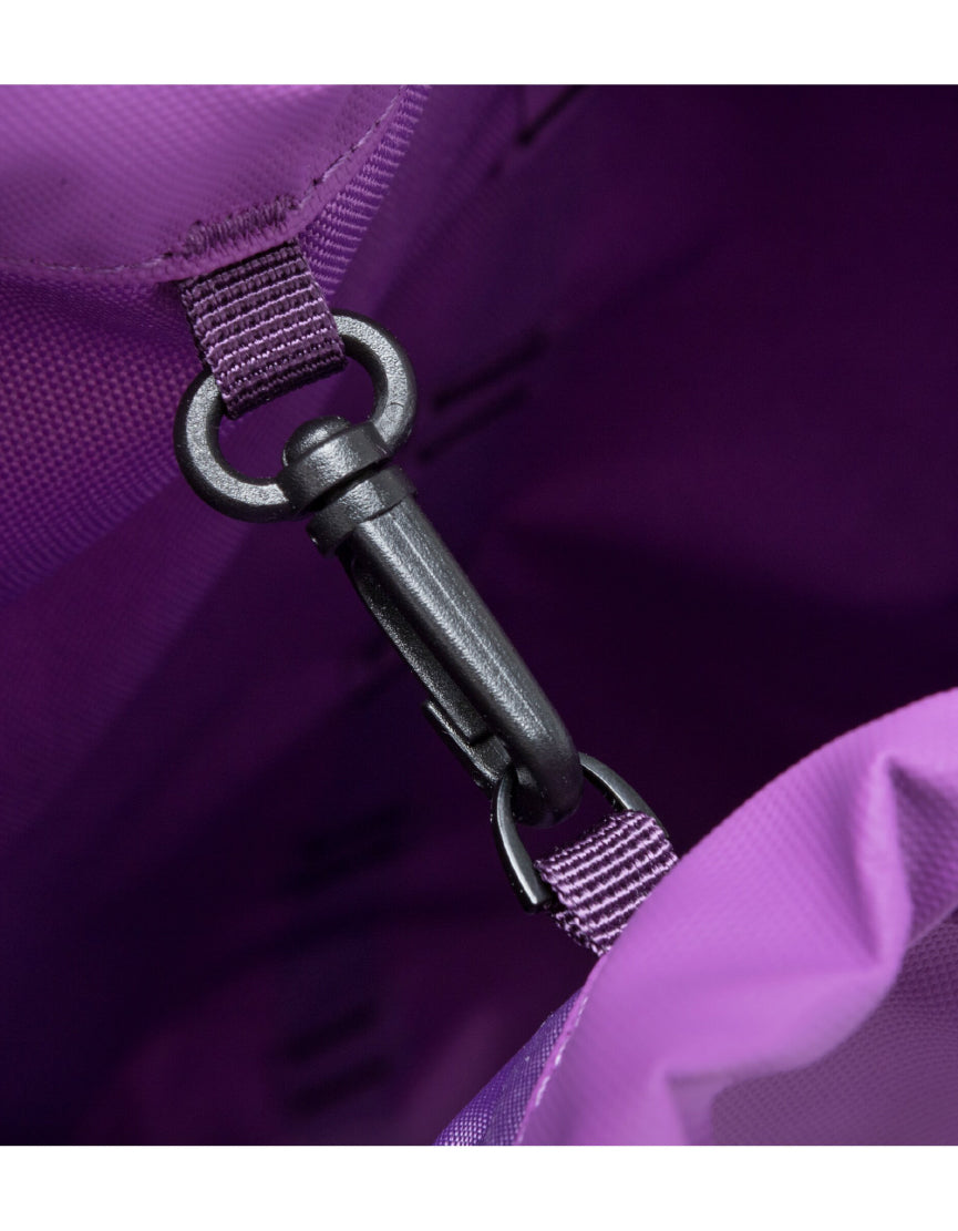 The spacious main compartment features an adjustable drawstring opening with a clip-top safety feature, leading to a well-organised interior with an elasticated 15” laptop sleeve, zip pocket pouch with a keyring clip, and dedicated slip pockets for phones, pens, and other essentials.